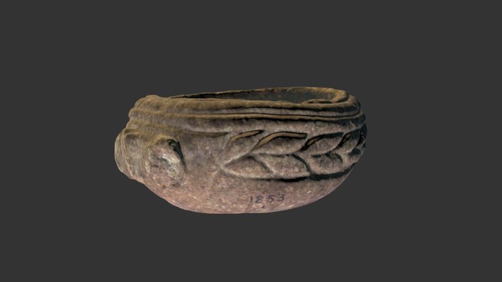 3D model of a stone bowl found in a Pictish cairn at Dalcharne, in the Strath of Kildonan, in 1853. The vessel comprises an oval bowl with one broken short lug-like, perforated handle. It is made from a soft rock, similar to soapstone, and has concentric and unusual repeated wheat sheaf decoration. The blackening at one at one end of the bowl may signify burning reside and its possible alternative use as a lamp. Dated 500BC-500AD. Physical object held at the Timespan Museum. Part of the Iron Age Kildonan reconstruction.